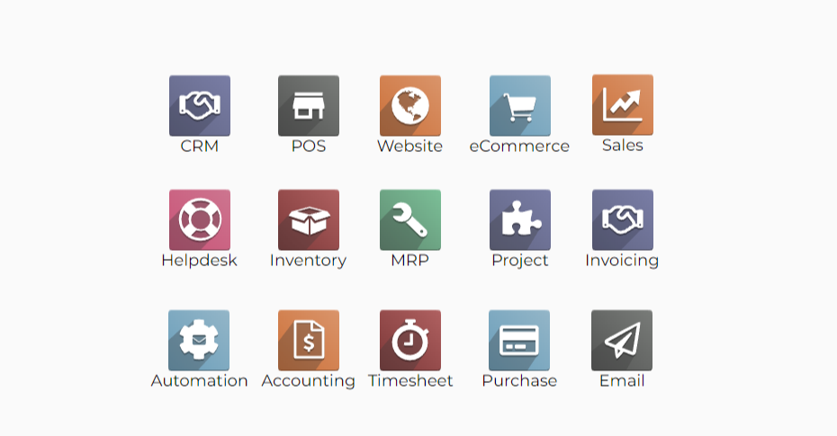 Odoo is an open source ERP software suite consisting of several modules such as Sales, CRM, Project management, Warehouse management, Manufacturing, Accounting and Human Resources, etc.